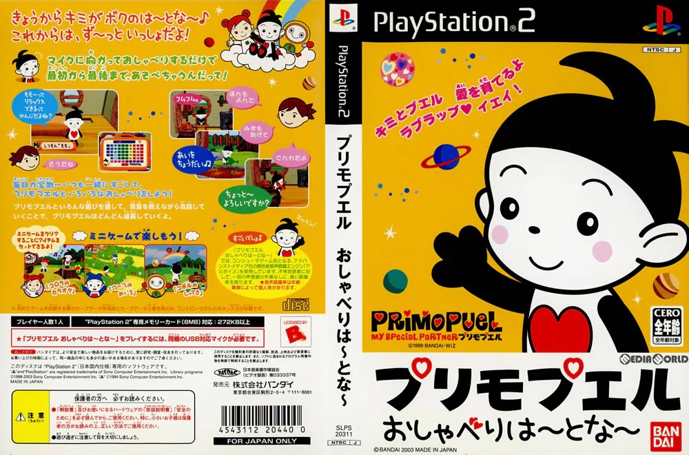 In this interactive game, players can talk to PRiMOPUeL using a USB microphone or enjoy mini-games like Corola’s karaoke, Cobol’s shooting gallery, and Pupus maze. Completing these mini-games earns items that expand PRiMOPUeL’s vocabulary, wardrobe, and the furniture and play equipment you can place in your virtual home.