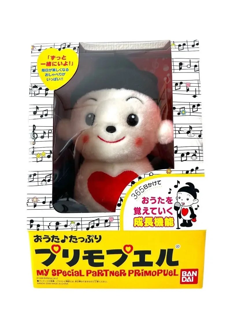 PRiMOPUeL is a toy line co-developed by Bandai and Wiz, featuring characters designed by Akiyasu Nishimura with concept development led by Bandai’s Katsura Arai. The name derives from the Latin words primum (“first”) and pueri (“boy”). The franchise expanded into a wide range of merchandise—including food, books, and various collectibles—but its centerpiece was the line of interactive dolls. While specific features varied slightly between series, the core functions of the dolls remained consistent across all generations. The main unit includes seven built-in sensors and switches, allowing it to respond to touch and voice by talking, singing, and engaging with the user. Its mood and personality evolve based on how often you interact with it and how you treat it, giving it a growing, learning personality. It can also learn new words and songs over time.